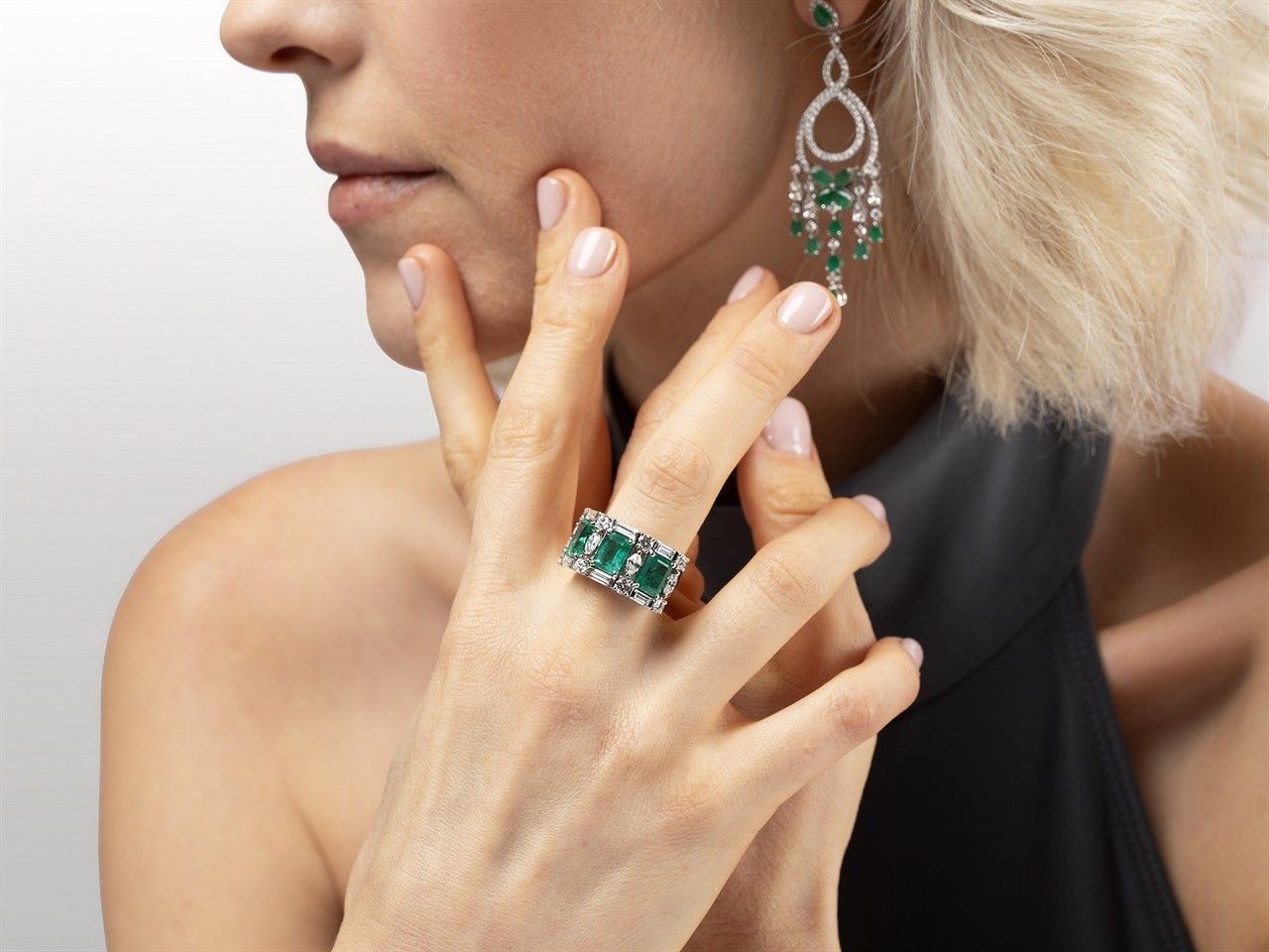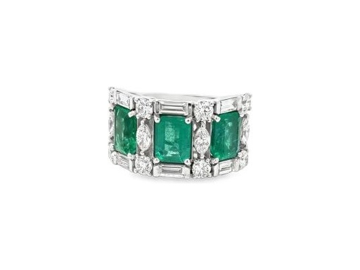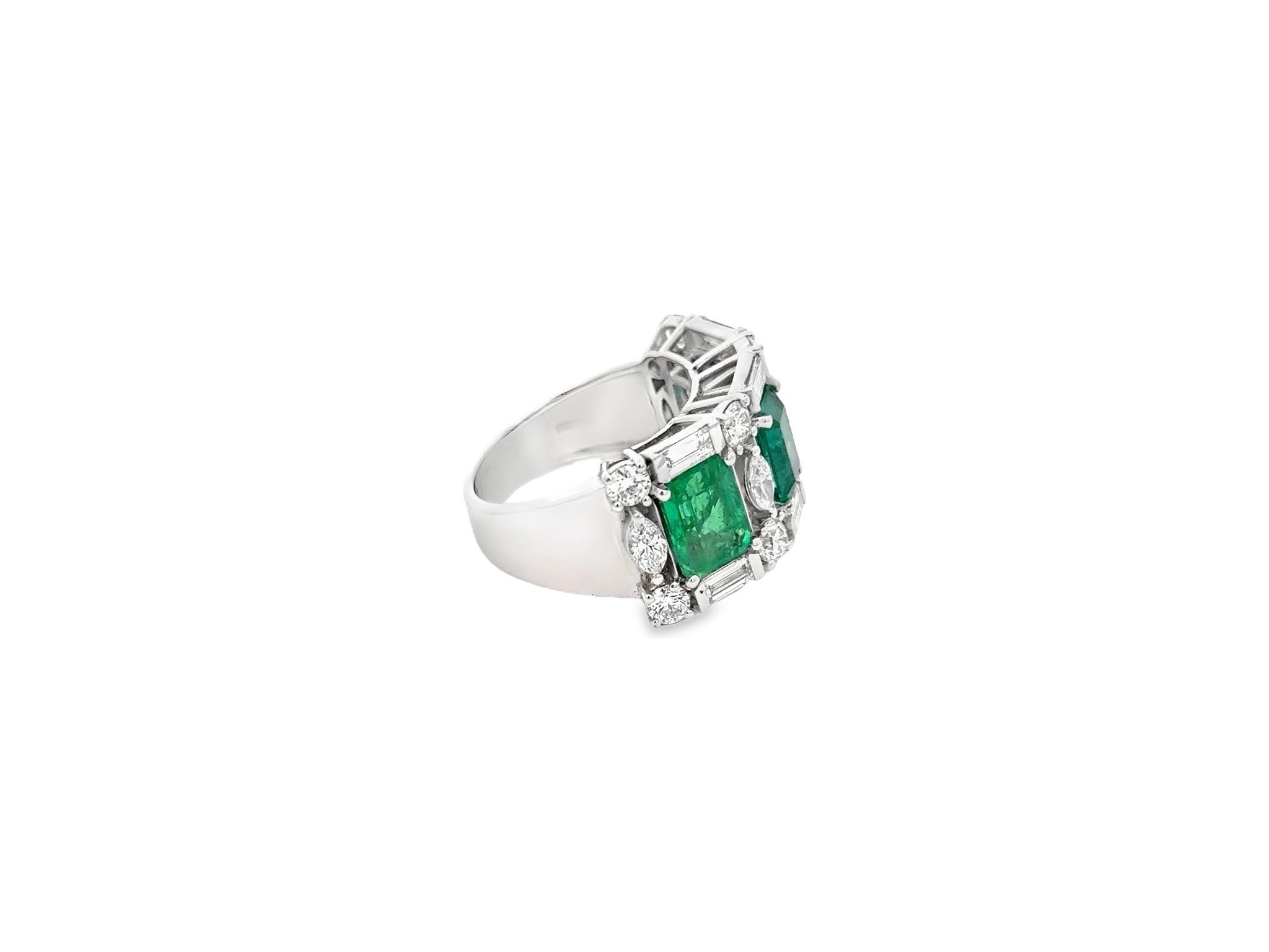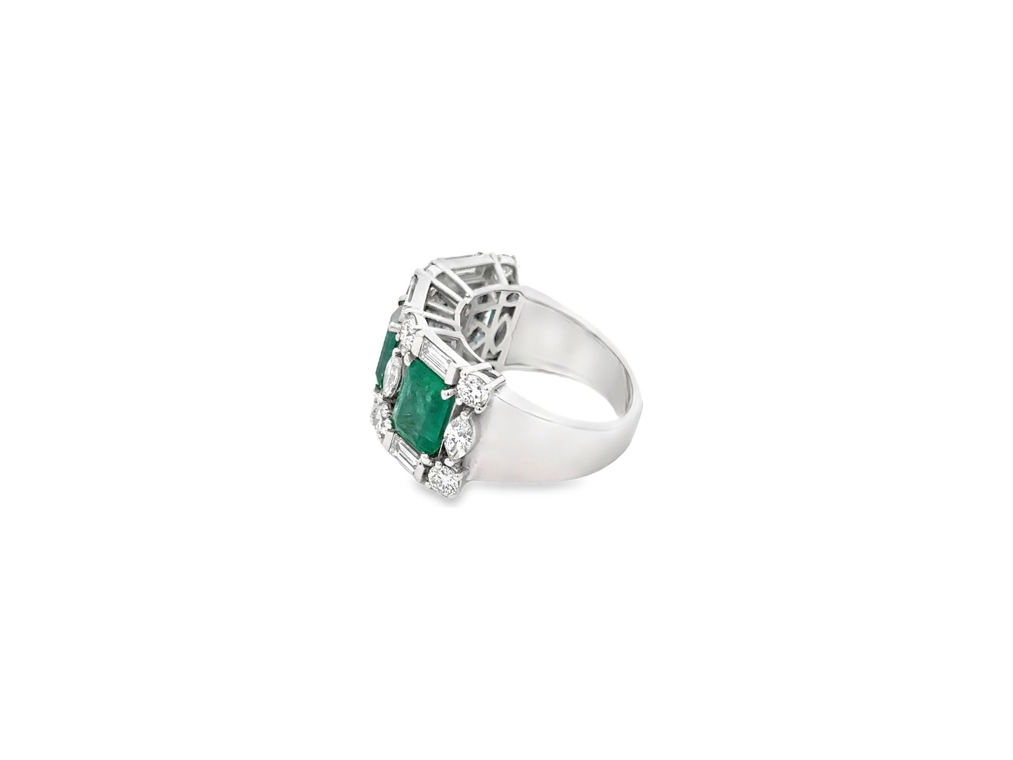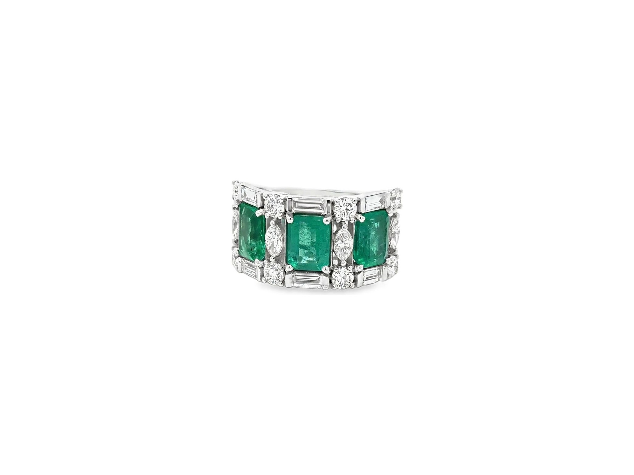 18K White Gold Ring with Emerald-Cut Emeralds, Natural Baguette, Marquise and Round Diamonds